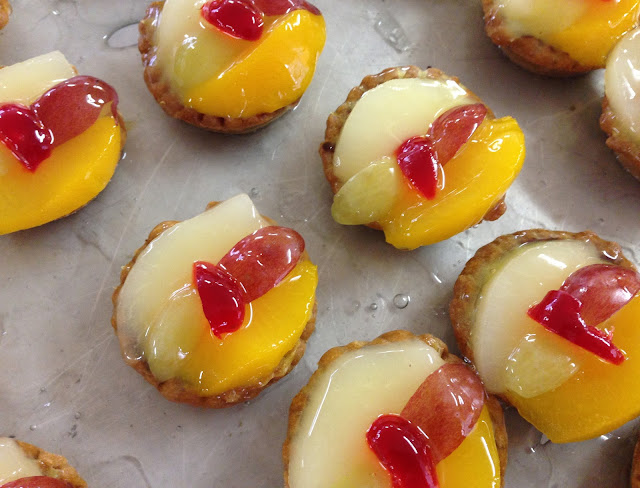 Spread some melted chocolate in the tartlets before you fill them. The filling is vanilla custard mixed with whipped cream.